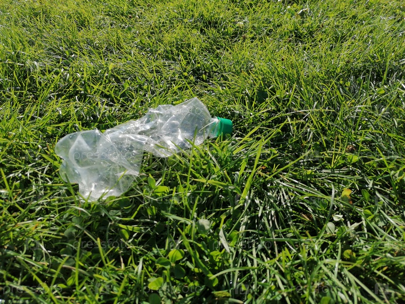 На зеленой траве лежит мусор пластиковая бутылка