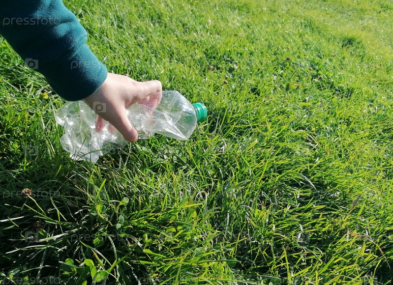 На зеленой траве лежит мусор пластиковая бутылка. Человек собирает мусор