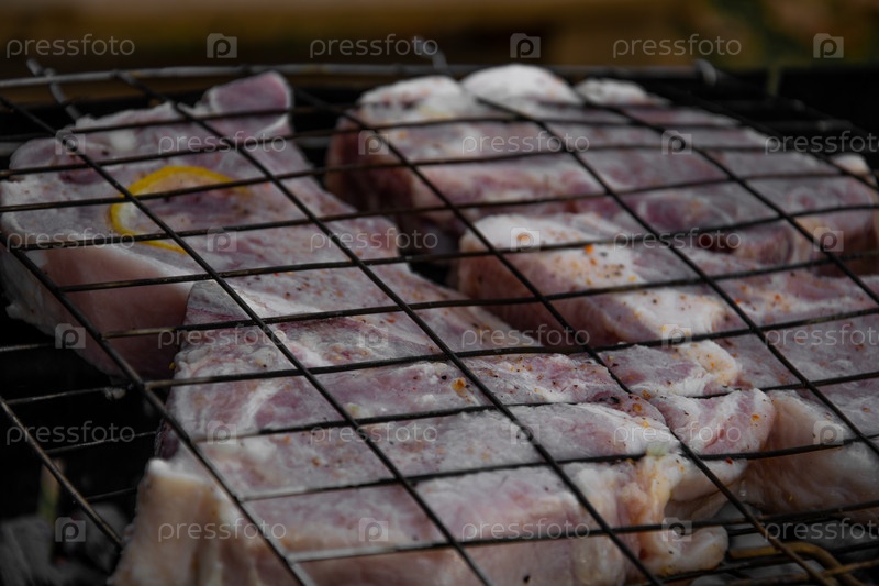Куски сырого мяса посыпанные приправой, долька лимона, в решетке не мангале