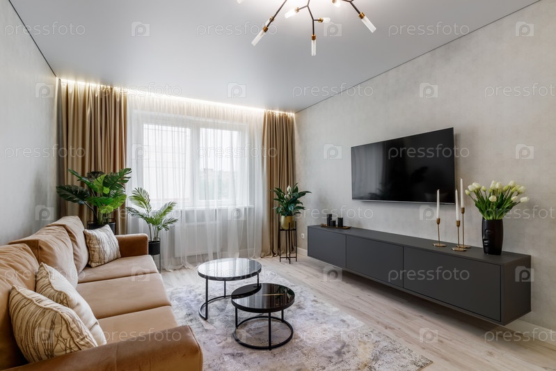 Дизайн интерьера уютной гостиной с телевизором, креслом, журнальным столиком и увядшими цветами в вазе