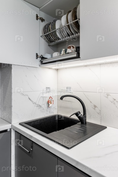 Черная ракушка и черный матовый журавль расположились на белых поверхностях фарфоровых тарелок, имитирующих внешний вид натуральных камней. Открытый шкаф с посудой