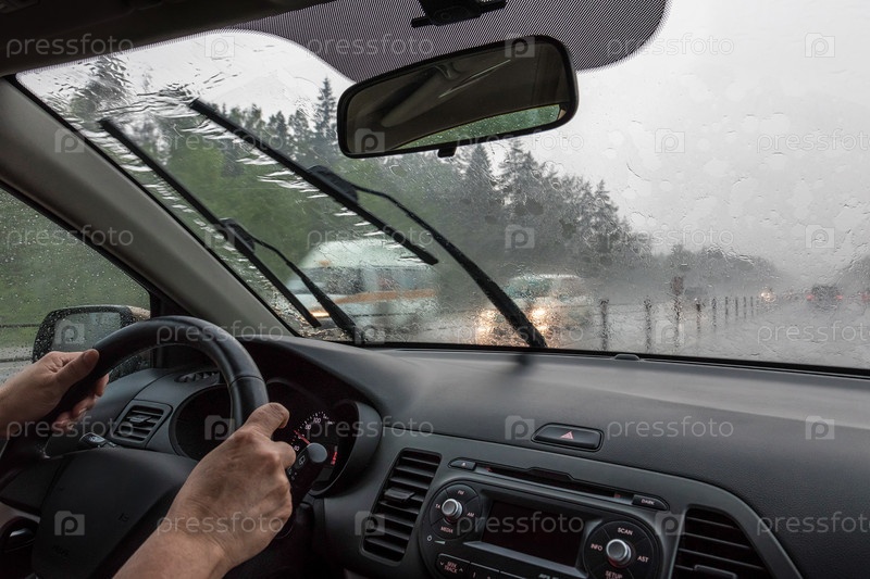 Вид через залитое дождем лобовое стекло. Размытые силуэты автомобилей. Руки водителя и часть салона автомобиля