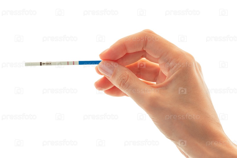 Кавказская женская рука держит тест на беременность с двумя полосками. Изолированные на белом фоне