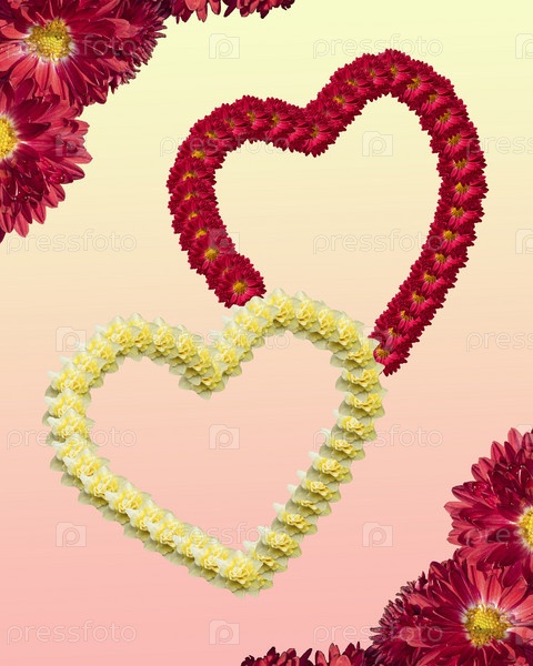 Открытка со связанными сердцами. Два цветочных сердца на градиентном фоне в пастельных тонах с рамкой из цветов. Открытка на День святого Валентина, День матери, свадьбу, женский день