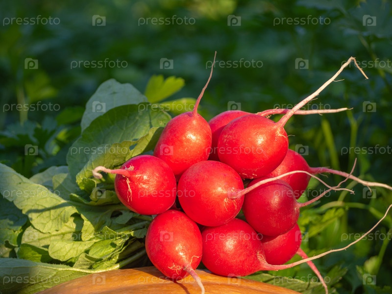 Выращивание органических овощей. Крупный план свежесобранной редьки на фоне зелени в саду. Здоровое питание с использованием натуральных продуктов с органической фермы. Плоды красной редьки