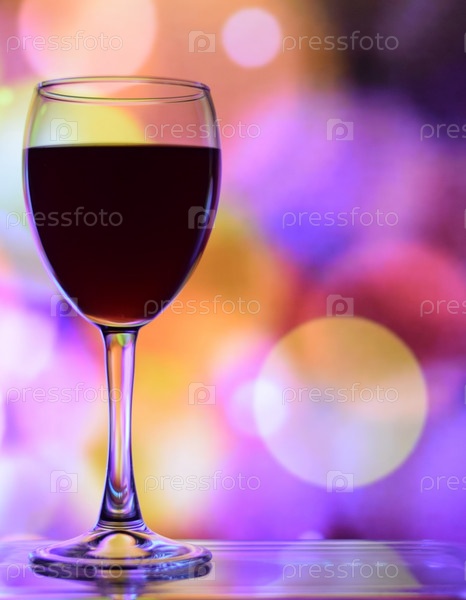 Бокал красного вина стоит в баре на стеклянной подставке, фон боке