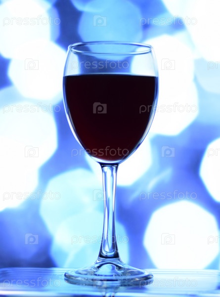Бокал красного вина стоит в баре на стеклянной подставке, фон боке