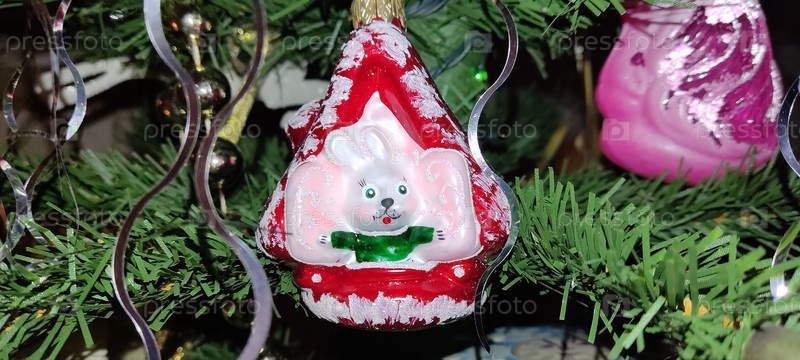 Заяц в избушке на ветках елки. Елочная игрушка. Праздничный фон. Новый год и Рождество