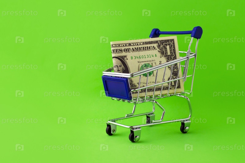 Корзина с купюрой в 1 доллар на зеленом фоне