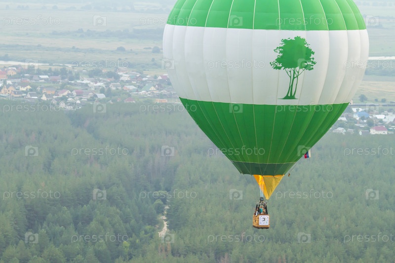 Воздушный шар в небе, вид с воздуха на деревню. Полет на воздушных шарах. Соревнования по воздухоплаванию