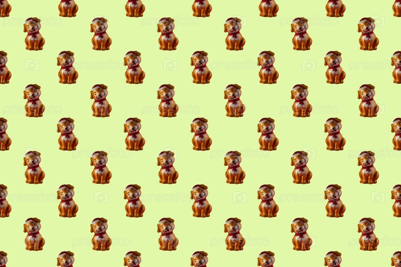 Бесшовный рисунок с собаками на зеленоватом фоне. Красивая игрушечная собака с красным шарфом на шее и красной кепкой на салатовом фоне для дизайна или обоев