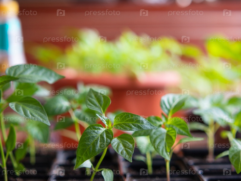 Рассада перца в ящиках. Рассада перца. Молодые зеленые растения перца с листьями, растущими в боксексе на подоконнике в помещении. Рассада. Садоводство. Рассада перца чили. Молодое растение