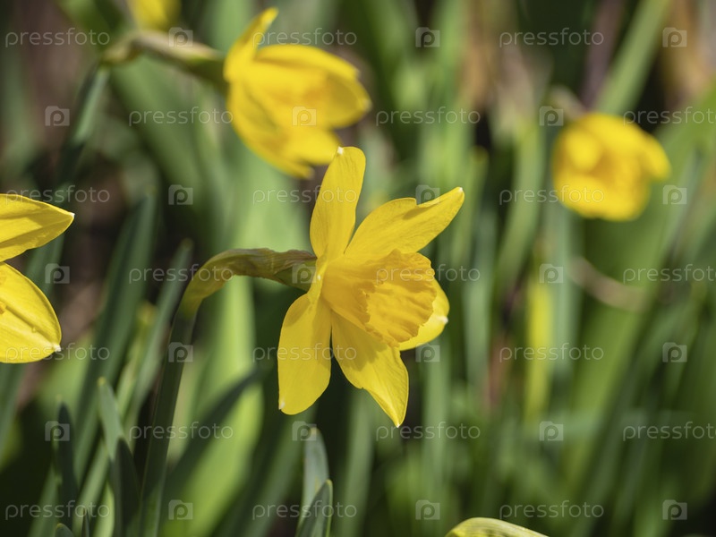Весной в саду расцветает желтый нарцисс. цветок нарцисса. Цветы нарцисса и зеленые листья на заднем плане. Крупный план красивых желтых цветов