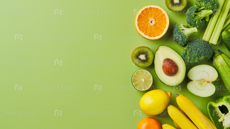 Овощи и фрукты. Нарезанный авокадо, киви, брокколи, лимон, яблоко, апельсин, сельдерей, капуста, банан, болгарский перец, помидоры. Концепция здорового питания пищевых продуктов. Различные сезонные ингредиенты