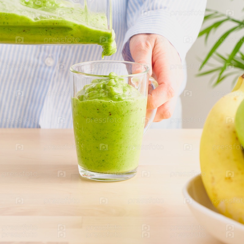 Сыроедение, зеленый смузи с бананом и шпинатом. Женщина наливает детокс-напиток из блендера