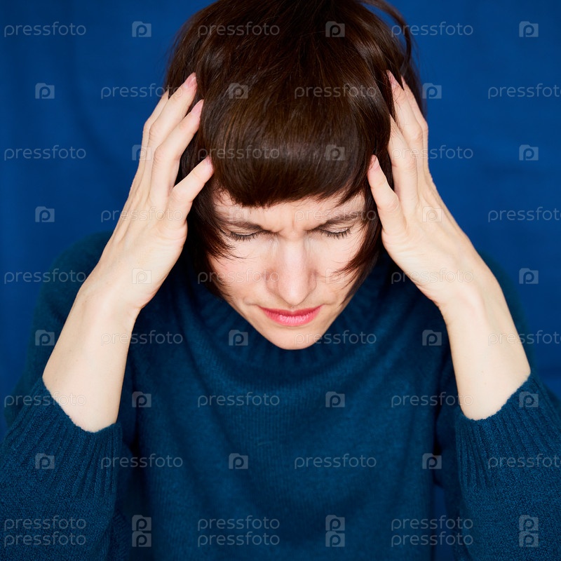 Портрет зрелой женщины в беде, крупный план. Взволнованное напряженное лицо. Яркая темно-синяя стена