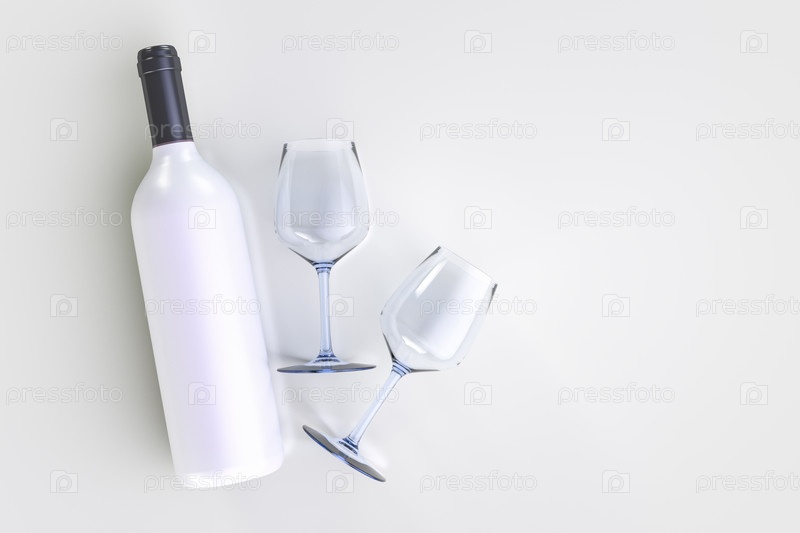 На столе белая бутылка вина и два бокала. Вид сверху