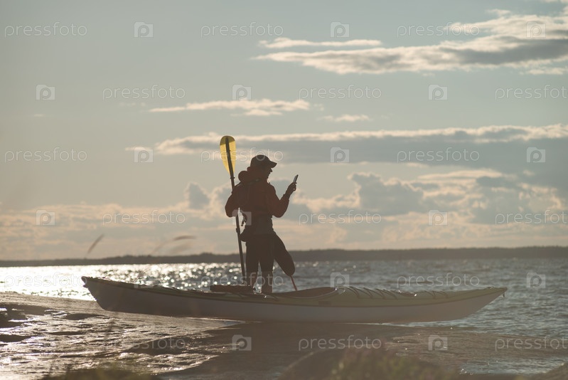 Каякер проверяет прогноз погоды в смартфоне. Водные виды спорта. Активный образ жизни