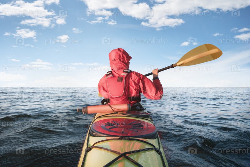Каякер гребет в открытом море. Вид сзади. Активный образ жизни