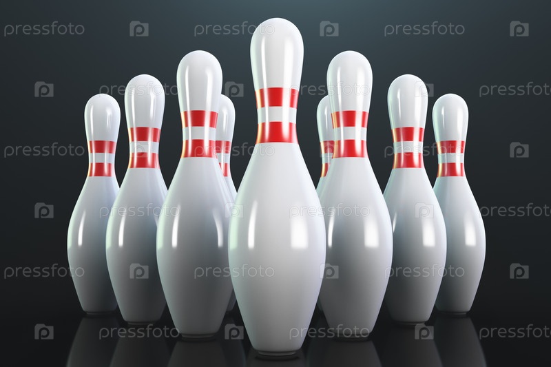 Десять кеглей на полу. Крупный план