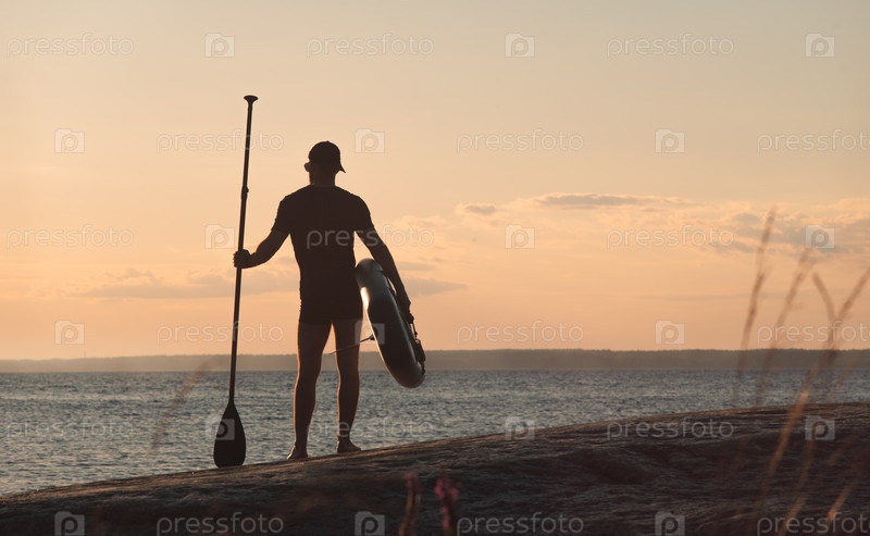 Серфер с байдаркой стоит на берегу. Вид сзади. Залив на заднем плане