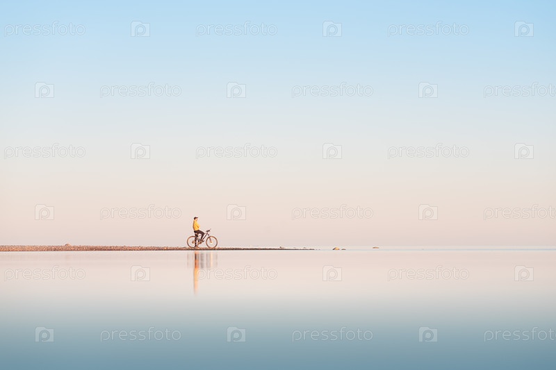 Велосипедист на берегу спокойного моря. Дальний план