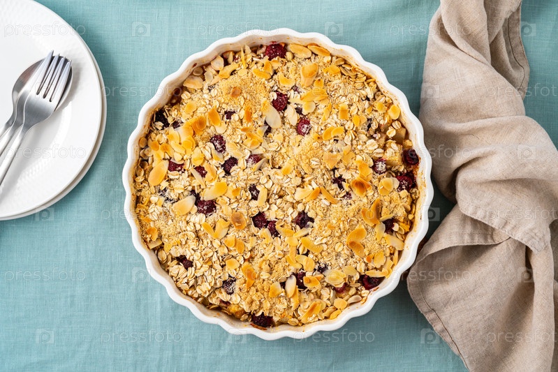 Целое яблоко и груша в крошке с мороженым, овсяным штрейзелем. Сладкий десерт с компотом