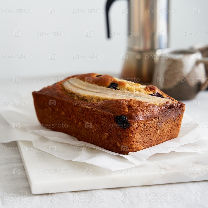 Банановый хлеб, цельный торт с бананом и черникой. Утренний завтрак с кофе