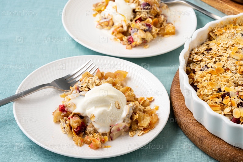 Яблочно-грушевый крамбл с мороженым, штрейзель. Рассыпчатая овсяная смесь с фруктами, вид сбоку