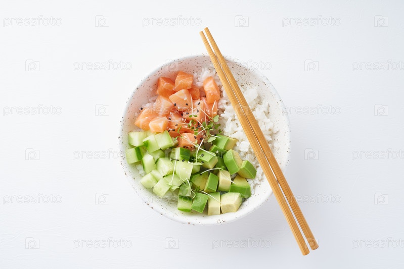 Поке из лосося со свежей рыбой, рисом, огурцом, авокадо