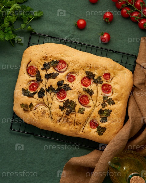 Искусство еды. Фокачча, лепешки с помидорами, на темно-зеленой льняной текстильной скатерти. Вид сверху