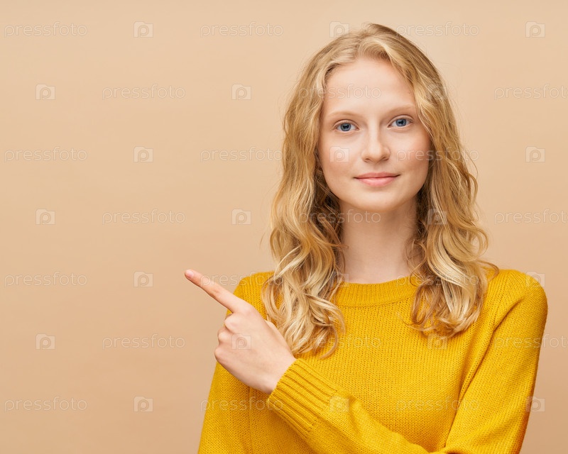 Талия вверх портрет женщины, указывающей направление пальцем, указывает рукой