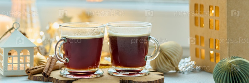 Горячий кофе эспрессо с молочной пеной и палочками корицы на рождественском украшенном баннере на подоконнике. Легкая гирлянда, интерьерная зимняя композиция, холодная и уютная концепция