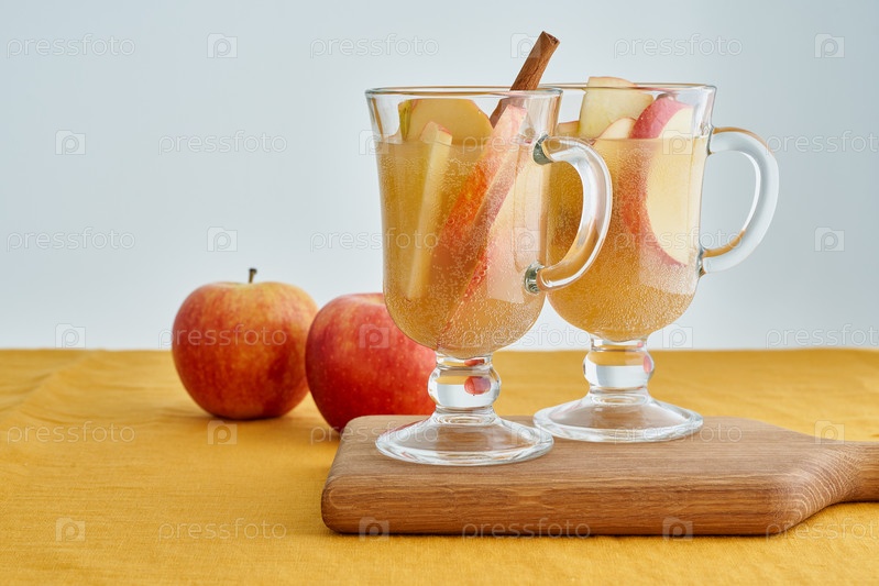 Два стакана яблочного сидра. Горячий зимний напиток с корицей, кардамоном и гвоздикой, апельсином
