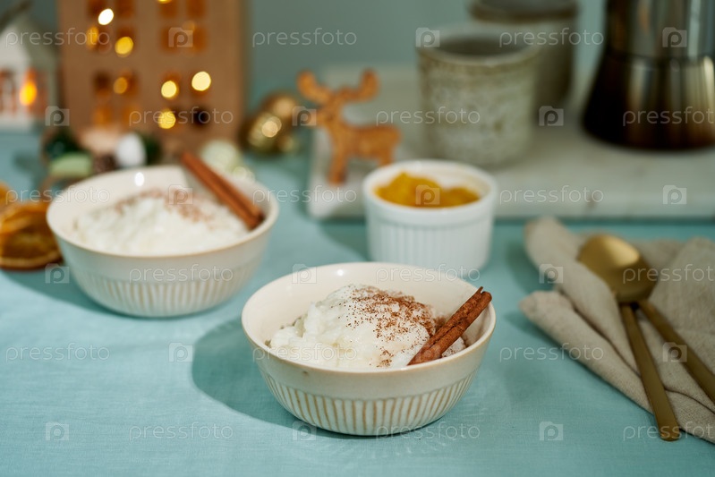 Рисовый пудинг. Французский молочный десерт. Рождественский вечер или ночь с уютным светом лампы в темном доме