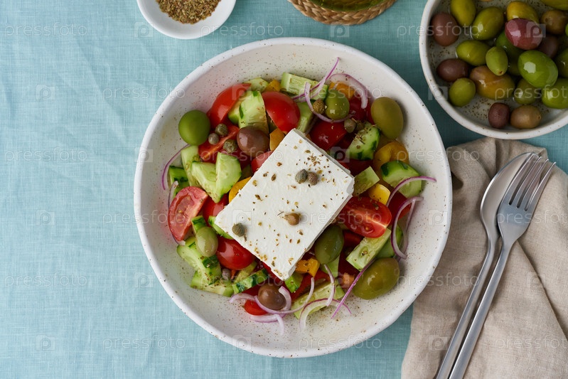 Греческий деревенский салат хориатики с фетой, вид сверху, копия пространства
