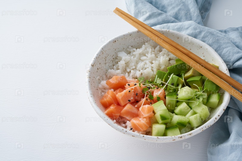 Поке из лосося со свежей рыбой, рисом, огурцом, авокадо