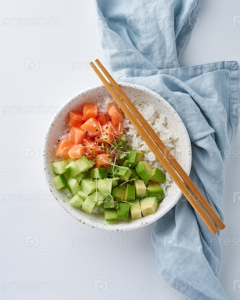 Поке из лосося со свежей рыбой, рисом, огурцом, авокадо