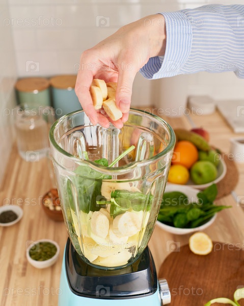 Женщина готовит утренний завтрак для веганов, бросает шпинат и бананы в чашу блендера для детоксикации смузи и здорового питания из свежих овощей и фруктов. Сырой зеленый коктейль, вертикальный