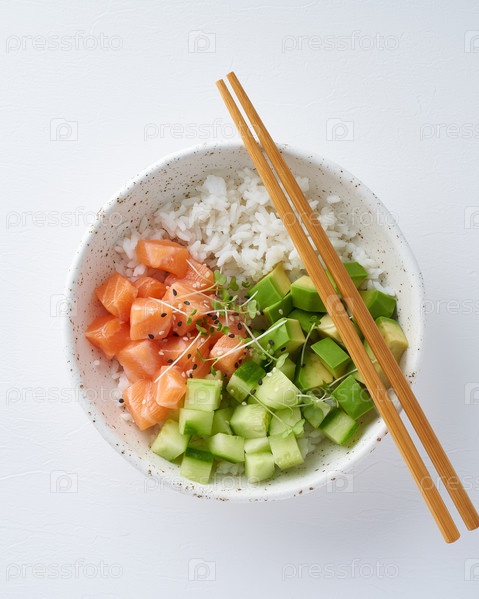 Поке из лосося со свежей рыбой, рисом, огурцом, авокадо