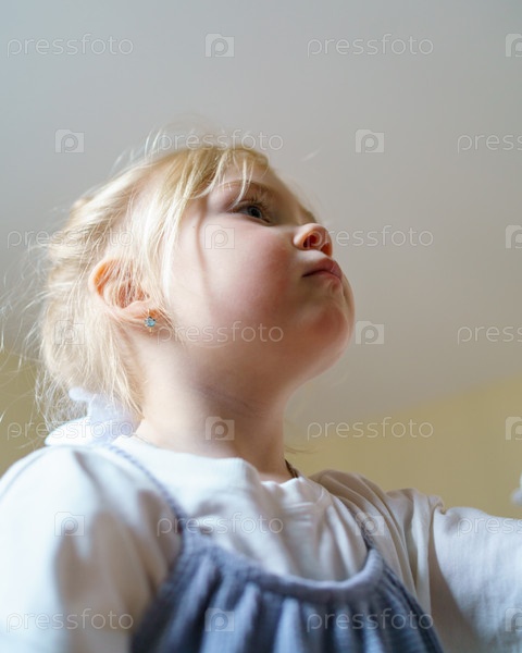 Красивая маленькая девочка смотрит на что-то, играя в помещении