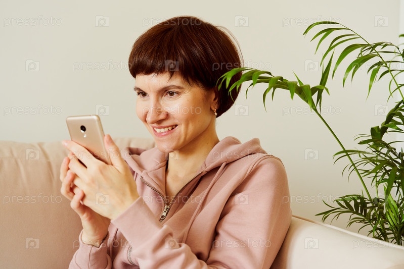 Портрет зрелой женщины, ищущей социальные сети на мобильном телефоне. Женщина средних лет в домашней спортивной одежде пастельных тонов сидит на диване и разговаривает в аудиочате с друзьями. Красивая улыбающаяся дама