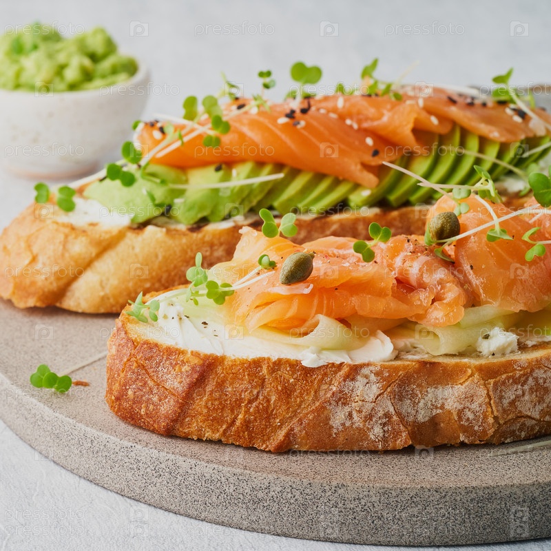 Два открытых бутерброда, тост с лососем, сливочный сыр, авокадо, ломтики огурца на белом бетонном столе