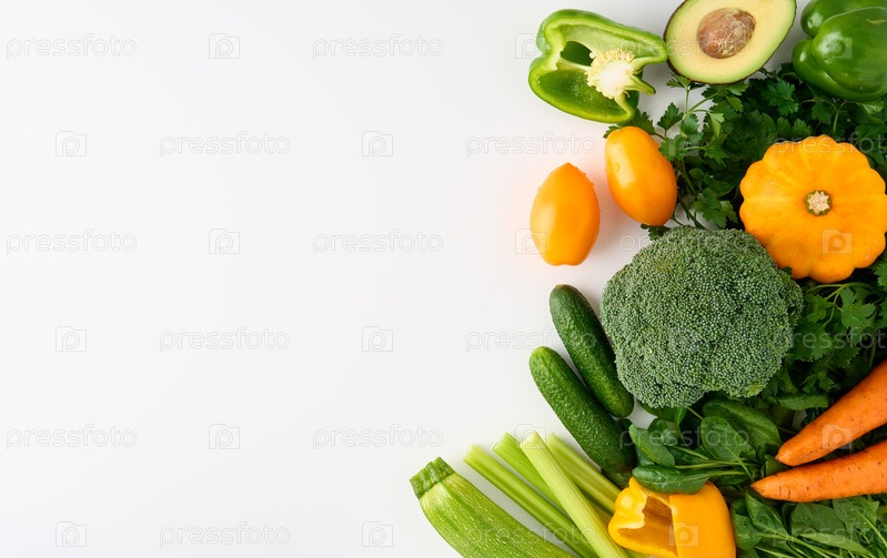 Веганская еда, вегетарианство. Набор ломтиков зеленых овощей и фруктов, ингредиенты для смузи. Правильное сбалансированное питание, здоровая вегетарианская пища. Вид сверху, пространство для копирования, белый фон