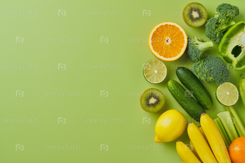 Овощи и фрукты. Свежий киви, брокколи, лимон, апельсин, сельдерей, капуста, банан, болгарский перец, помидоры. Концепция здоровых красочных диетических продуктов. Различные сезонные ингредиенты для приготовления пищи