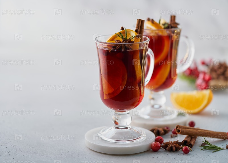 Горячий сезонный алкогольный напиток. Красный глинтвейн на белом фоне. Глювейн с кардамоном, палочкой корицы, гвоздикой, дольками апельсина, анисом, хвоей, клюквой. Скопируйте пространство, горизонтальное