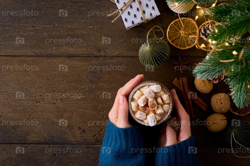 Анонимная женщина в синем свитере держит чашку горячего какао с зефиром и тертым шоколадом. Рождественские украшения на деревянном фоне. Скопируйте пространство, горизонтальное, выше