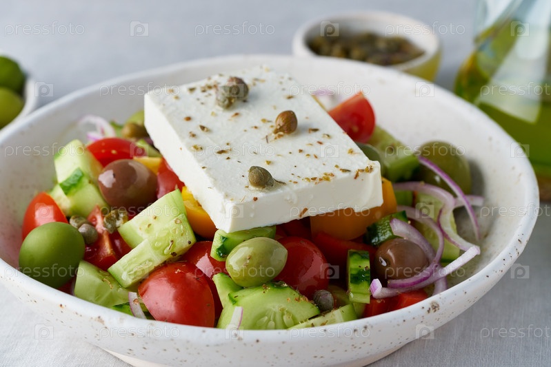 Греческий деревенский салат хориатики с сыром фета, вид сбоку, крупным планом