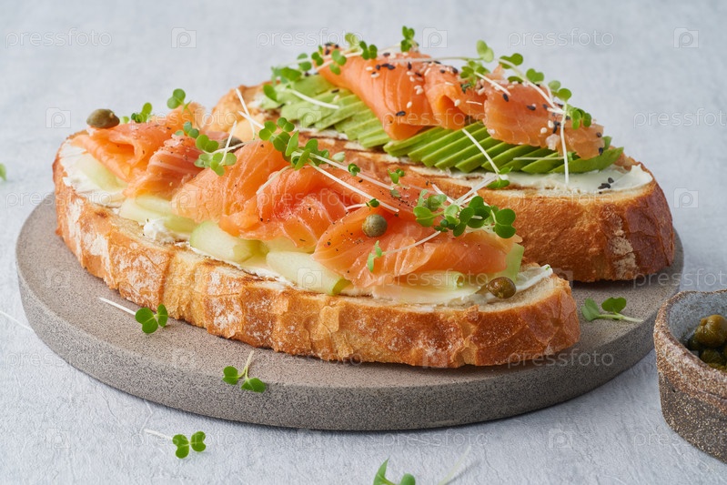 Два открытых бутерброда, тост с лососем, сливочный сыр, авокадо, ломтики огурца на белом бетонном столе