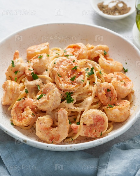 Паста спагетти с соусом из жареных креветок. Спагетти с морепродуктами. Макрос вид сбоку, вертикальный